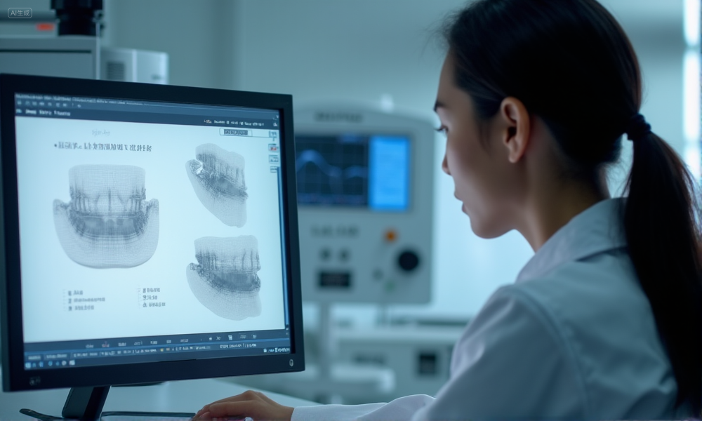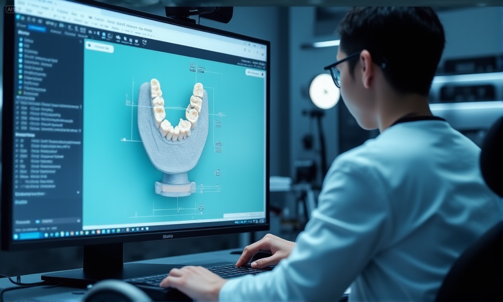 Prompt: A highly realistic, ultra-detailed, professional-quality photo captured in a clean, well-lit dental lab environment. Materials must be photorealistic, anatomically accurate, and rendered with DSLR-level clarity. Lighting should be soft daylight or studio white light, avoiding cold or bluish clinical tones. A Chinese dental technician is operating a CAD workstation, reviewing a 3D implant restoration design with occlusal adjustments highlighted, while a milling machine is visible in the background.