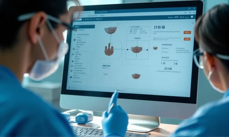 Prompt: A highly realistic, ultra-detailed image of a dental technician reviewing a digital case intake form on a monitor. The screen shows clearly labeled fields for restoration type, margin line, material choice, scan type, and technician notes. Nearby is a STL viewer displaying version comparison. Scene is clean, professional, with soft daylight.