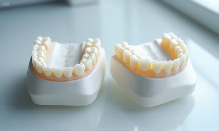 Prompt: A highly realistic, ultra-detailed, professional-quality photo captured in a clean, well-lit environment. Materials must be photorealistic, and rendered with DSLR-level clarity. Lighting should be soft daylight or studio white light. Side-by-side display of a zirconia full arch restoration and a PFM bridge on a reflective tray, showing esthetic translucency versus metal-backed structure.