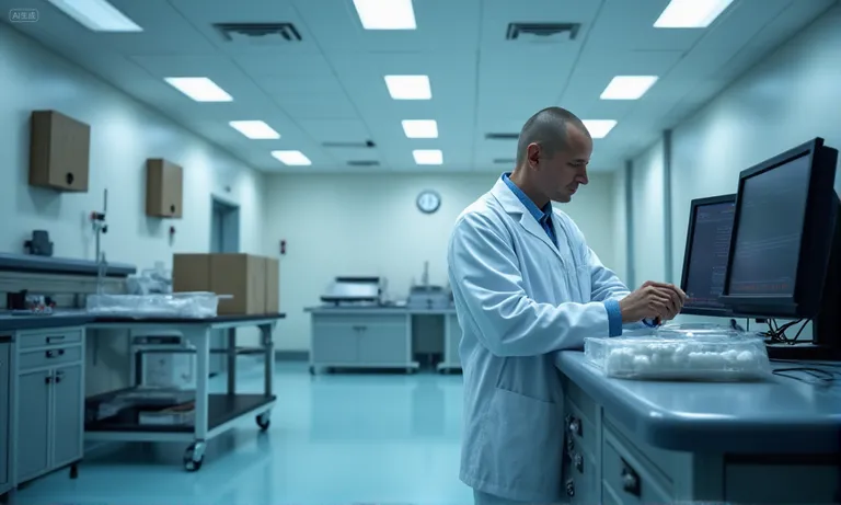 Prompt: A highly realistic, ultra-detailed, professional-quality photo captured in a clean, well-lit environment. Materials must be photorealistic, and rendered with DSLR-level clarity. Lighting should be soft daylight or studio white light. A production floor clock on the wall, technicians packing implant cases for shipment, and a QA inspector entering remake data into a computer system.