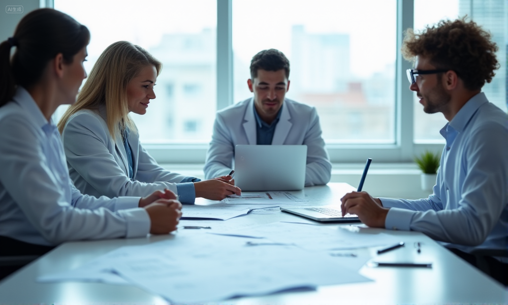 prompt: a highly realistic, ultra-detailed, professional-quality image in a modern dental lab conference room, with natural daylight. shows a compliance manager and team preparing for an audit, reviewing ISO and CE documents spread out on a large table, while a third-party auditor checks files on a laptop.