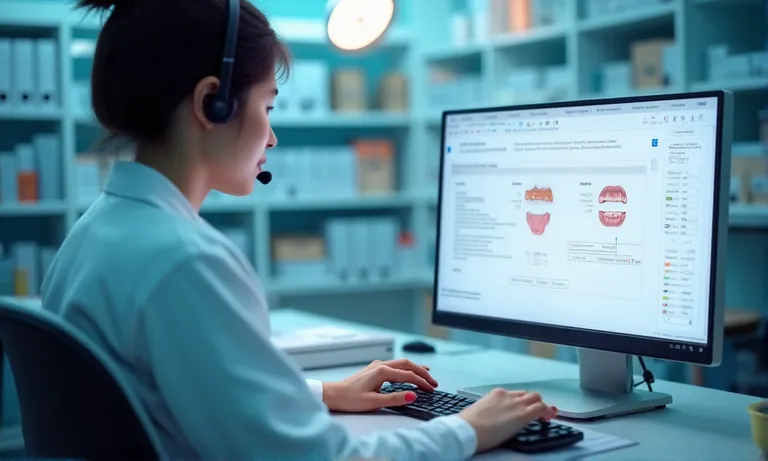 A highly realistic, ultra-detailed, professional-quality image captured in a clean, organized dental lab environment. Lighting is natural daylight. Show a customer support specialist responding to a case issue via live chat on a desktop, with digital dental files visible, headset on, and TAT tracker chart in the background.